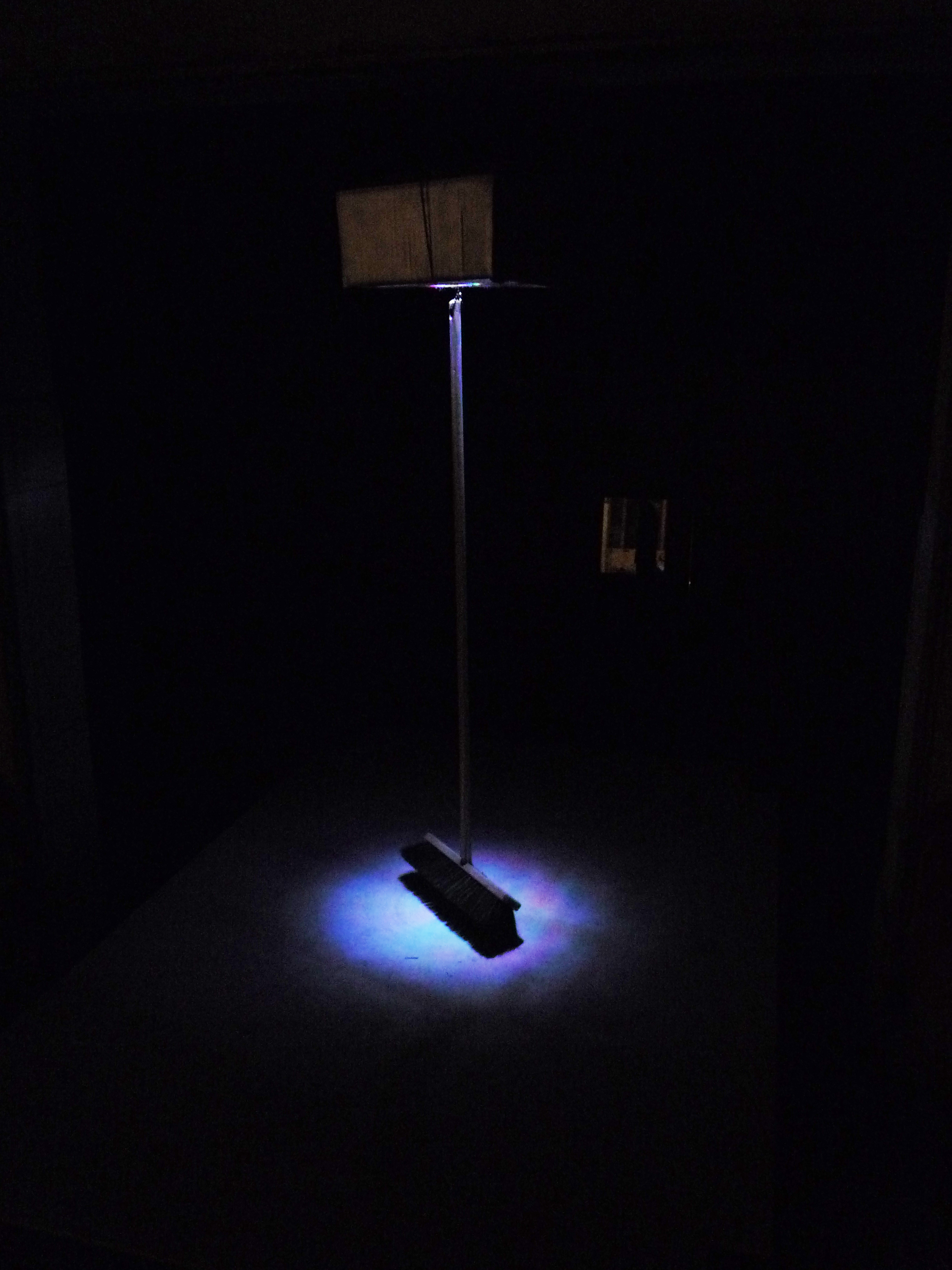 o.t. / installation besen dreht sich auf einer für ihn errichteteten bühne und wird diskobeleuchtet.